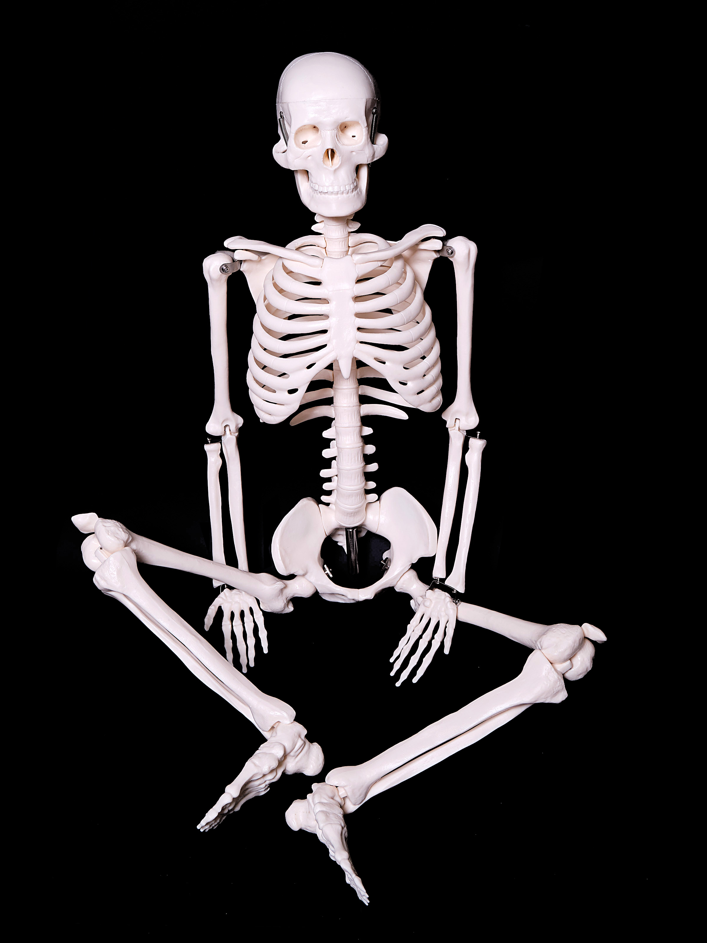 Кости выполнены в соответствии со строением скелета человека, и изготовлены из жесткого пластика белого (или светло-желтого) цвета. Крышка черепа съемная. Нижняя челюсть черепа подвижная, на пружинках. Верхние и нижние конечности легко съемные. Для сохранности при транспортировке конечности сняты. Скелету придана естественная поза стоящего человека. Позвоночник Гнущийся!. Ребра, тазовые кости и череп жестко соединены с позвоночником. Конечности присоединяются на шарнирах. Скелет устанавливается на хромированную стойку на металлической подставке